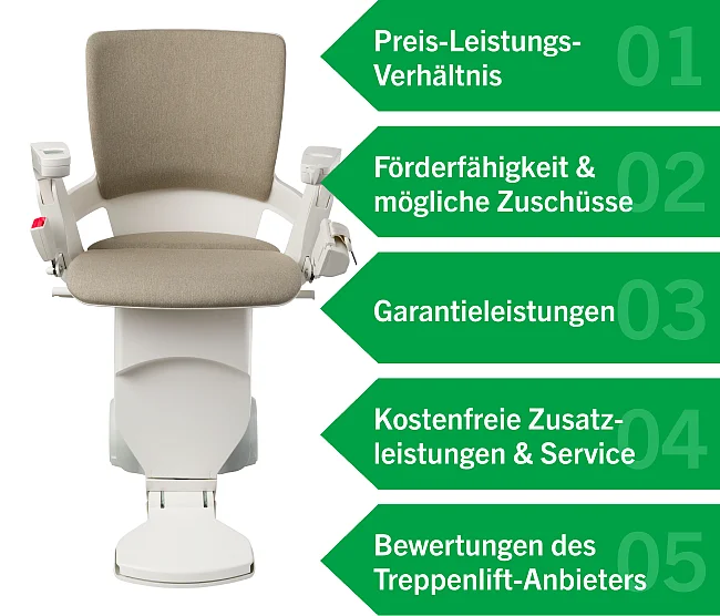 Beim Vergleich der wichtigsten Merkmale verschiedener Treppenlift-Anbieter finden wir das beste Angebot für Sie.